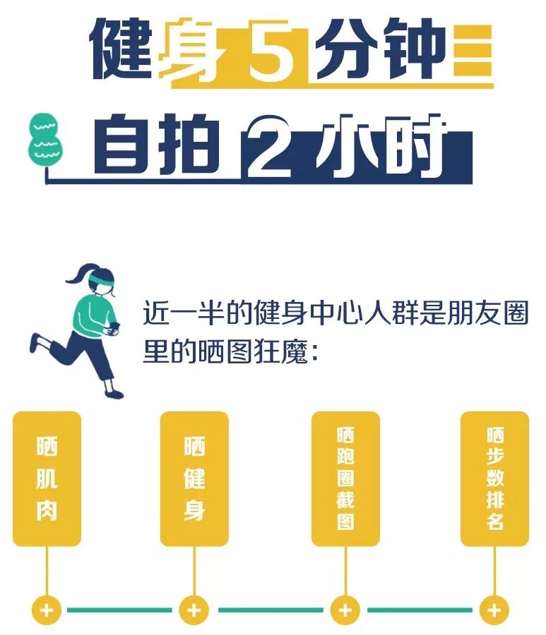 近一半的健身中心人群是朋友圈里的曬圖狂魔,其中80後更是一騎絕塵,獨立風騷。數據來源:美團點評,《2018健身行業白皮書》。