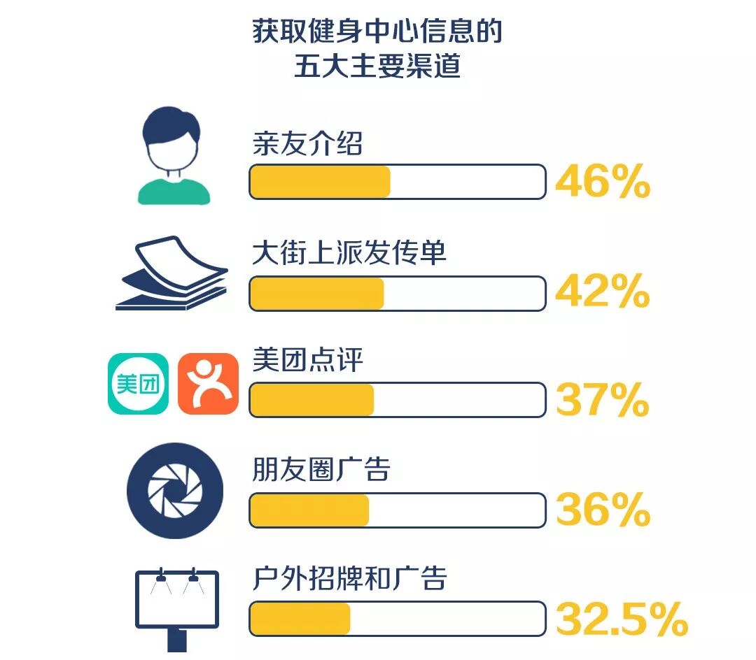 消費者一般通過親友介紹發現健身中心,其次是大街上傳單派發;與此同時,線上的行銷方式也逐漸顯現出強力效果,美團點評推薦/附近商戶搜尋與朋友圈廣告投放成為線上的一級入口。數據來源:美團點評,《2018健身行業白皮書》。