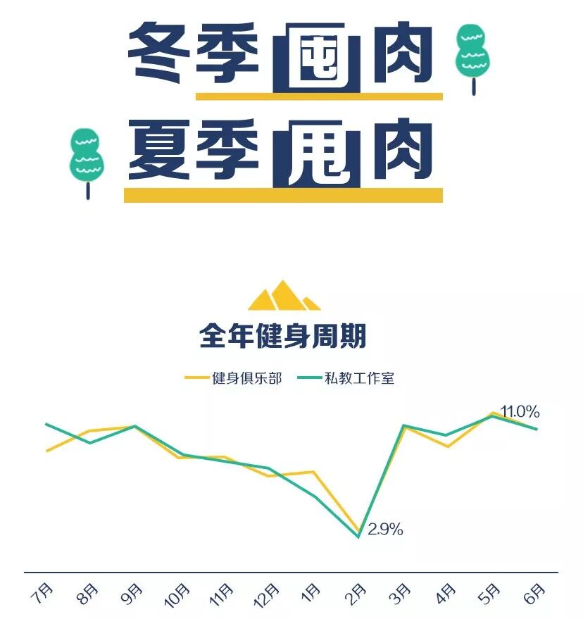 大部分人會在春節後開啟一年減肥計劃,並在「露肉」的季節達到巔峰水平。數據來源:美團點評,《2018健身行業白皮書》。