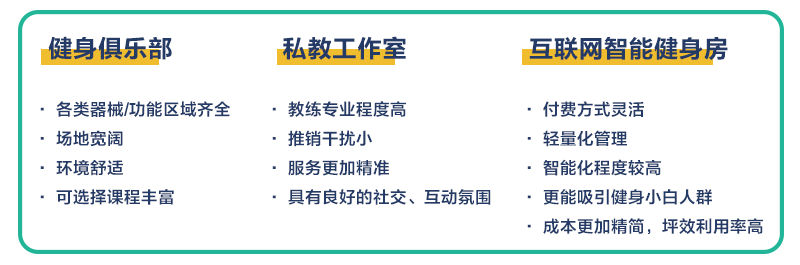 健身俱樂部、私教工作室、互聯網智能健身房的優勢分析。數據來源:美團點評,《2018健身行業白皮書》。
