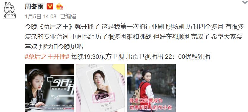 但是女主周冬雨在宣傳時直接在文案里打出了「職場劇」「行業劇」的關鍵詞,還有一眾演員轉發支持,又讓劇姐稍微燃起了一點點期待。