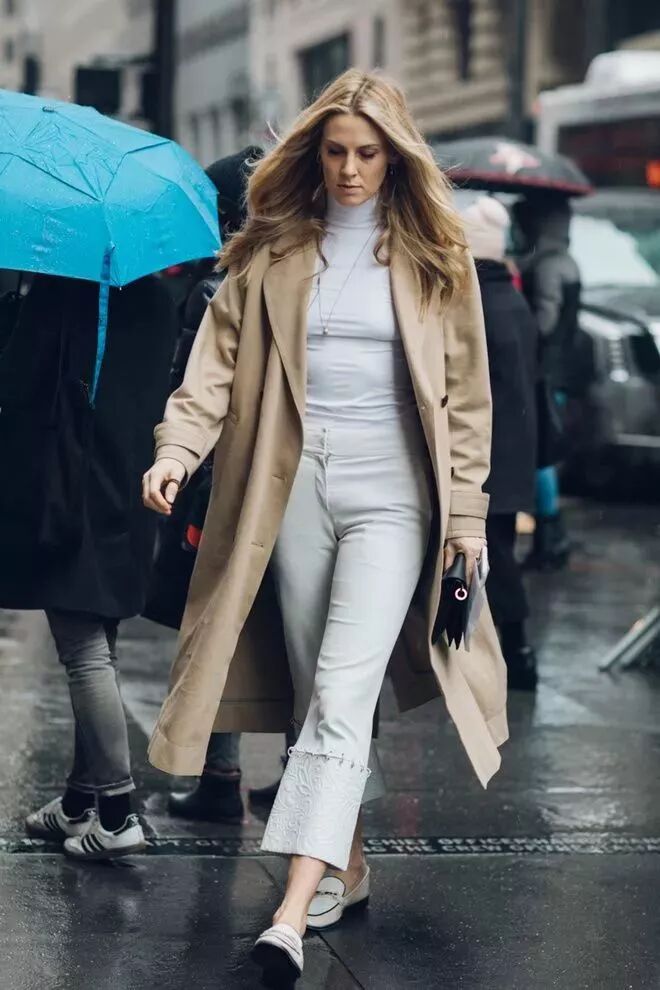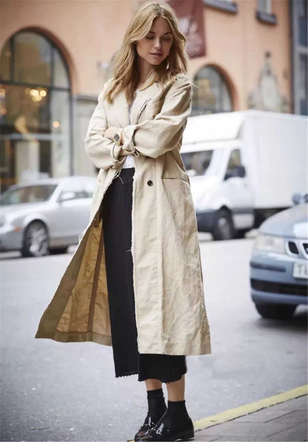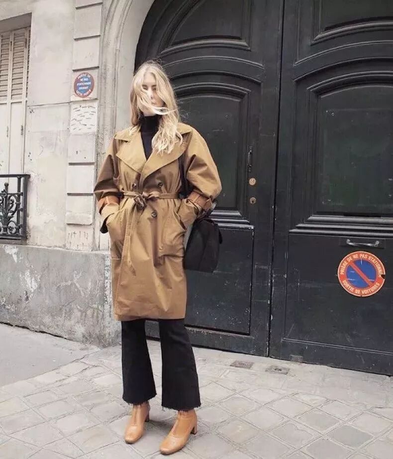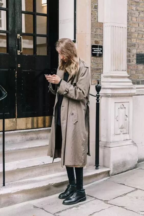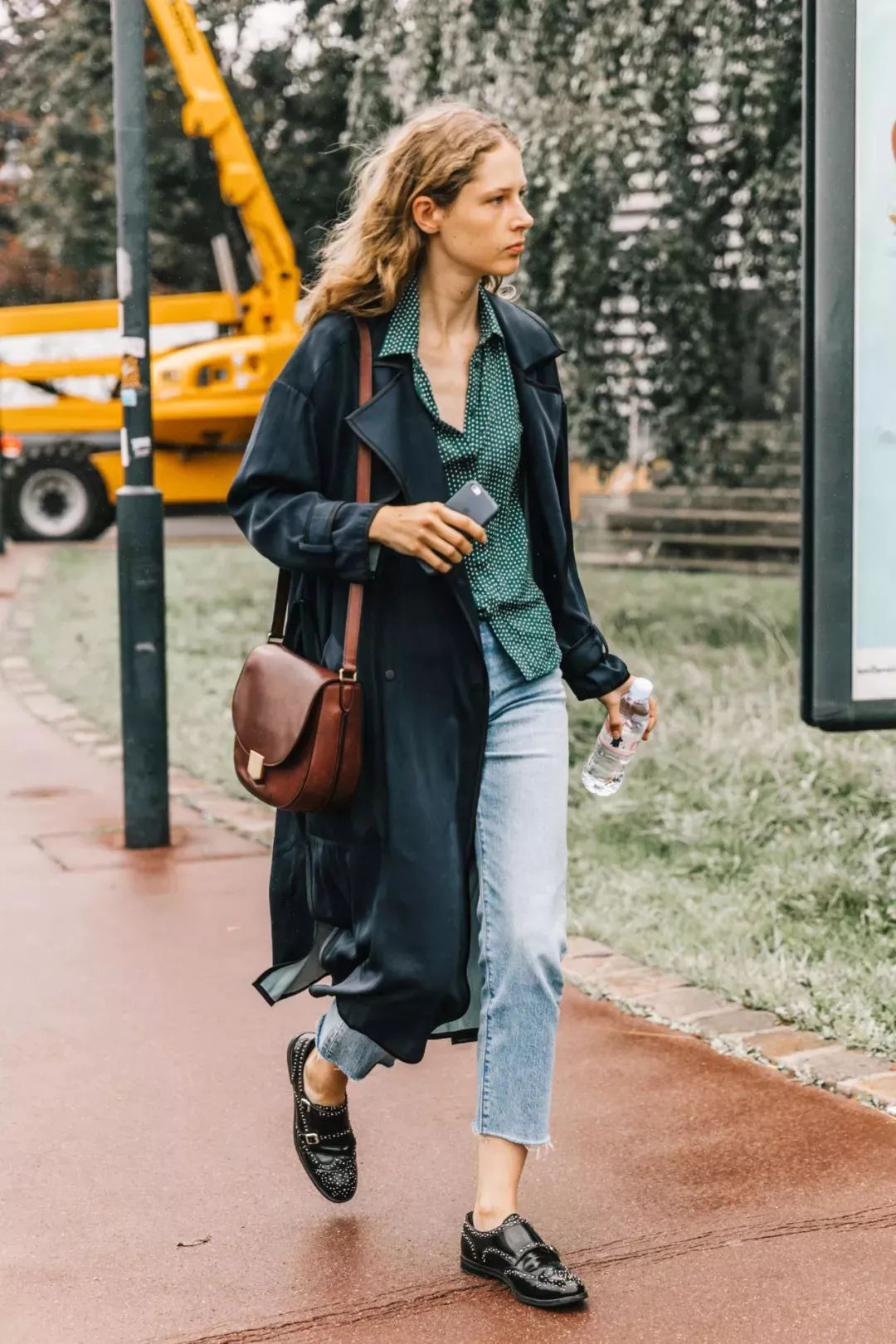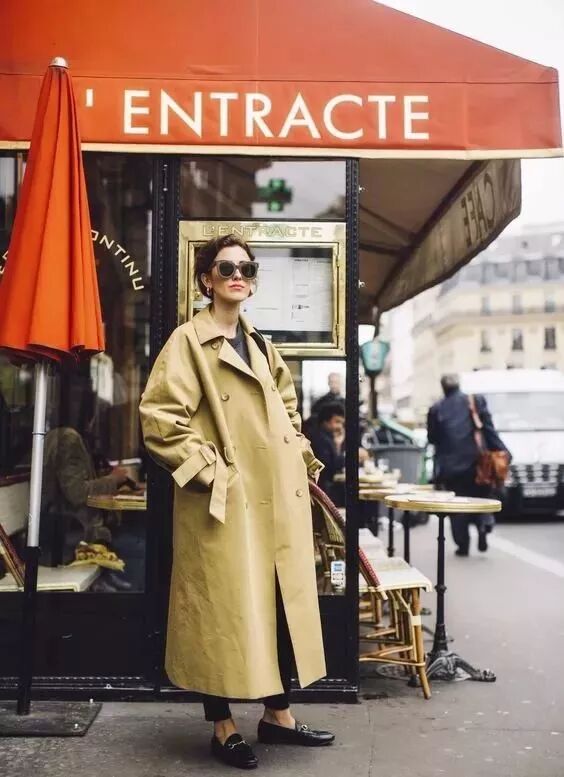 風衣+樂福鞋的組合自帶優雅標籤,簡單搭配一條小黑褲就非常有款有型腔調十足。