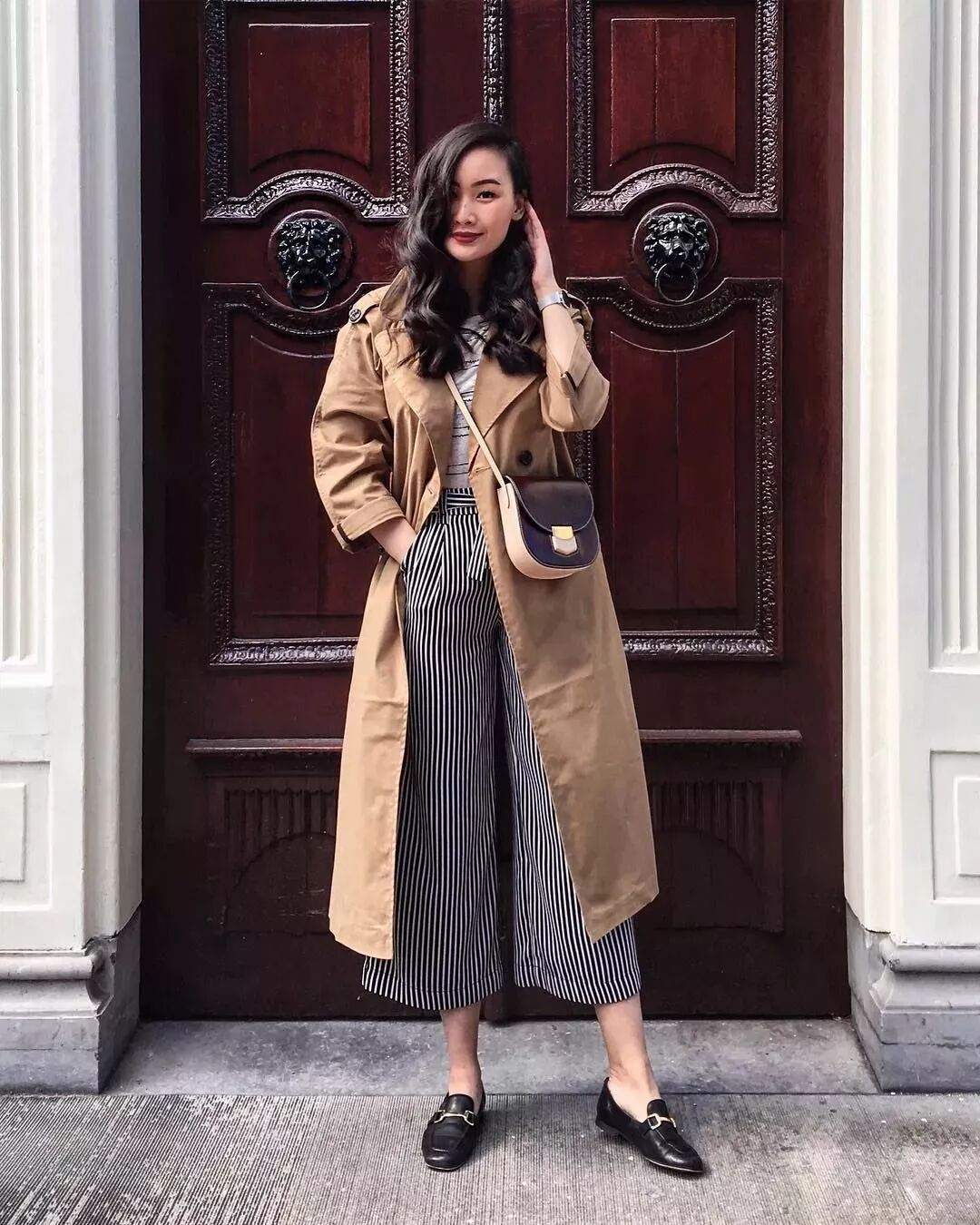 樂福鞋+風衣搭配闊腿褲也相當好看時髦,且酷且美綻放多樣魅力。
