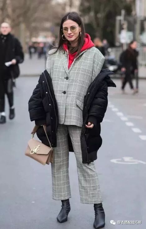 紅色衛衣+格紋套裝,鮮艷的顏色打破冬日的沉悶感,外搭黑色羽絨服,保暖的同時瞬間變成時髦精!
