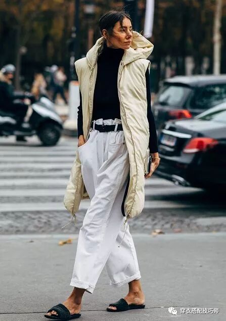 今年背心款的羽絨服也非常流行,內搭黑色毛衣和白色闊腿褲,系一根腰帶讓整個搭配乾淨又利落。