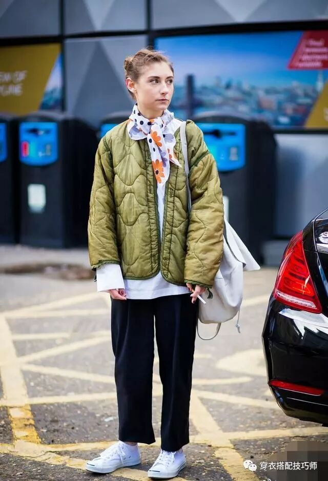 橄欖綠羽絨服+黑色闊腿褲,吸睛又時髦,還可以系一條印花絲巾,就能混搭出不一樣的高雅風情。