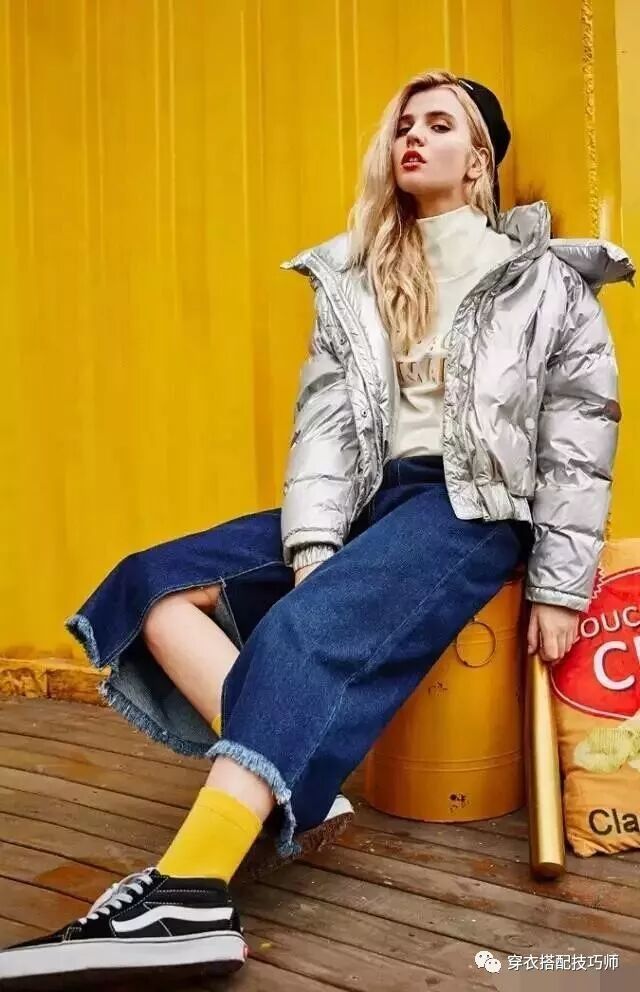 短款羽絨服+牛仔褲闊腿褲,不僅可以豐富造型的層次感,還能穿幾條秋褲也不怕顯胖,街頭架式十足。