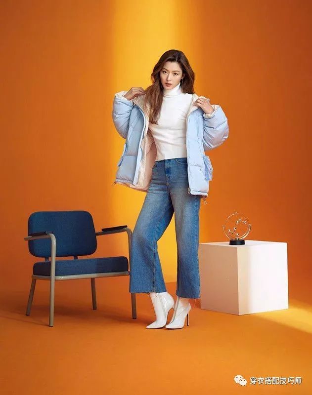女神全智賢將高領的白色毛衣搭配牛仔闊腿褲,外面搭配了一件淡藍色的羽絨服,溫柔又顯氣質。