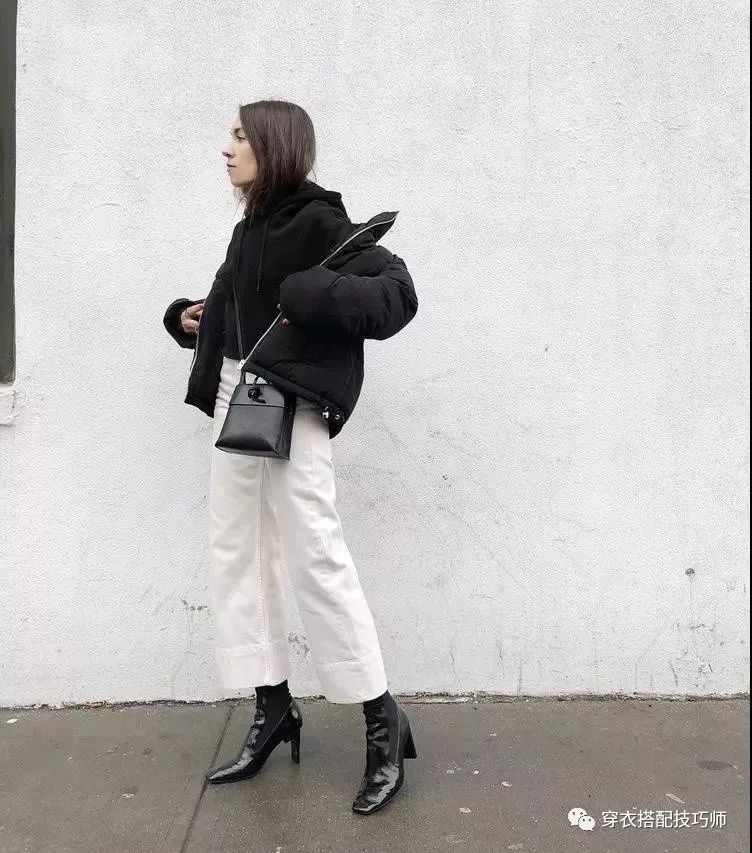 尤其是九分白色闊腿褲,搭配黑色羽絨服和一雙踝靴高級又時尚。