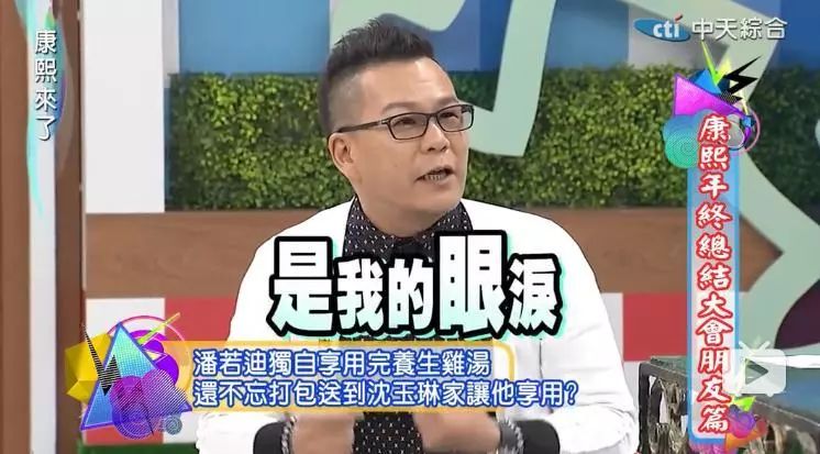 潘若迪給他送雞湯,他很感動。但說出來,就不是感動,而是段子了。「吃著吃著,發現天花板在漏水。可是天花板怎麼會漏水,原來是我的眼淚。」蔡康永邊笑邊罵他,「還漏水,你怎麼不漏尿啊你。」沈玉琳只是嘻嘻嘻地笑。