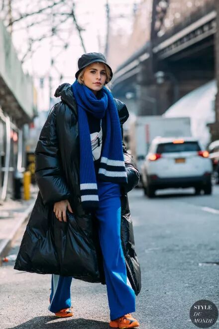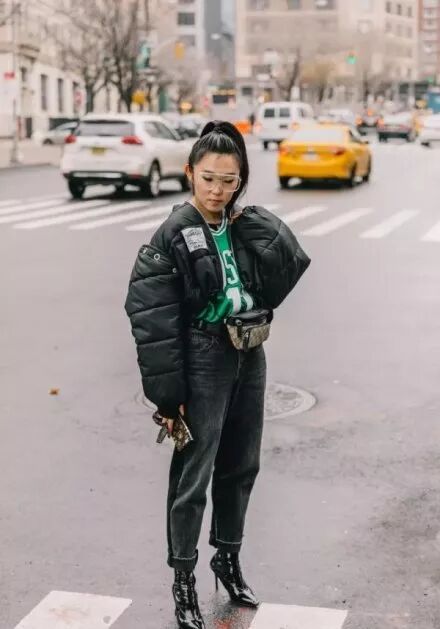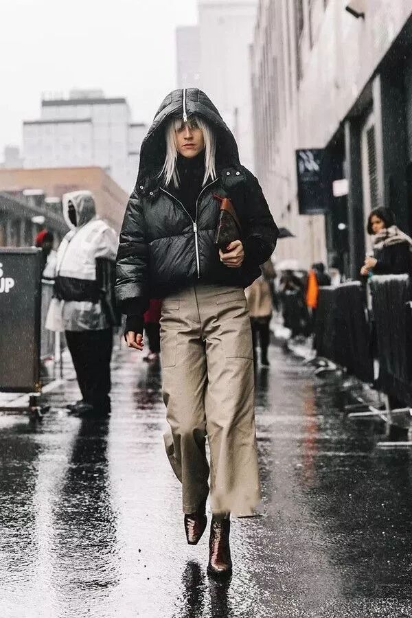 短款的羽絨服搭配闊腿褲,既能現出大長腿,又顯出girl crush風~但有一點要注意,一定要搭配高跟鞋,才能做到拉長視覺效果。