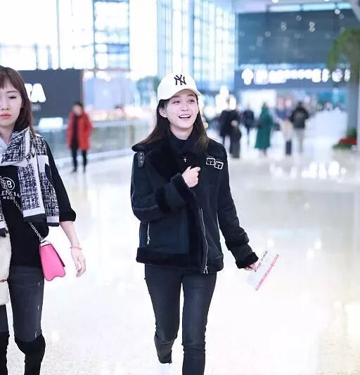 別看何泓姍穿的衣服黑,但真的 她人是真白呀。簡單的黑色外套搭配深色牛仔褲不僅襯出了何泓姍膚白貌美,而且有種運動青春感。