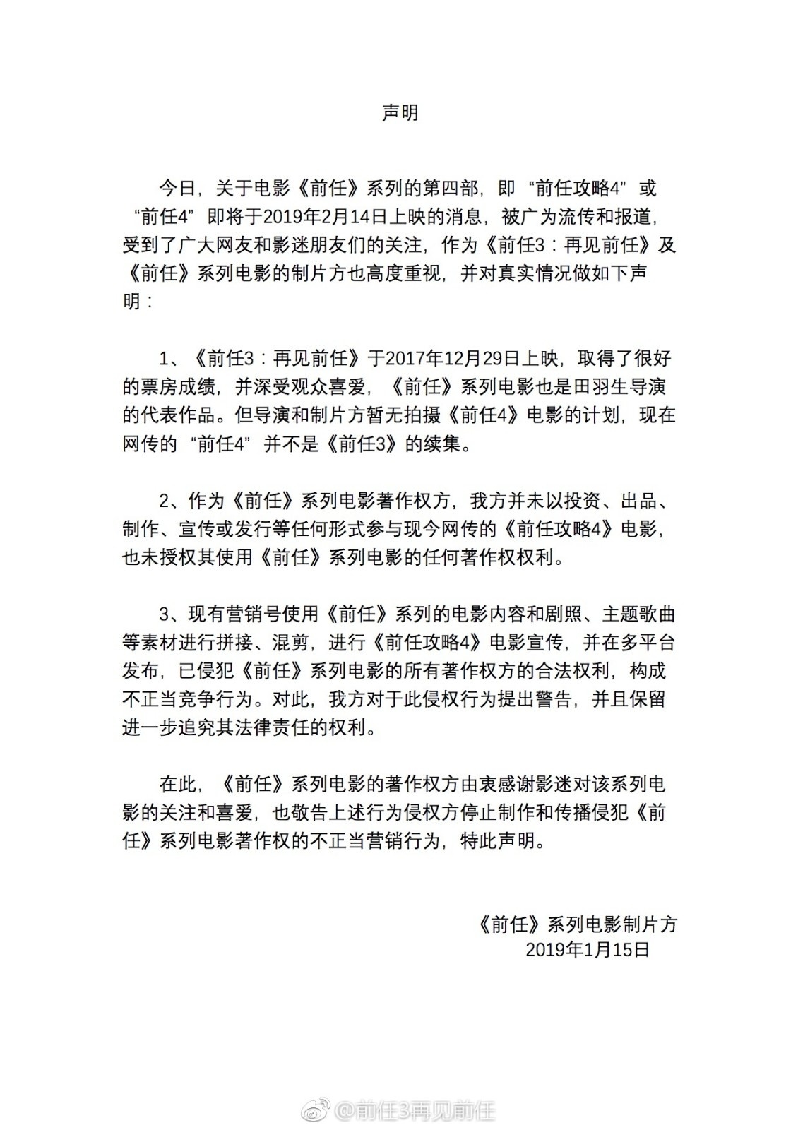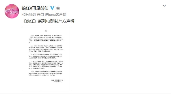 《前任》系列電影制片方聲明