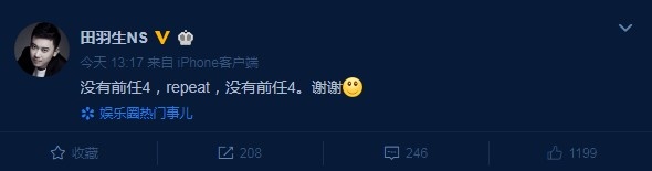1905電影網訊最近有傳聞稱《前任攻略4》將定檔2月14日情人節,1月15日,導演田羽生微博發文辟謠否認:「沒有前任4,repeat,沒有前任4。謝謝。」