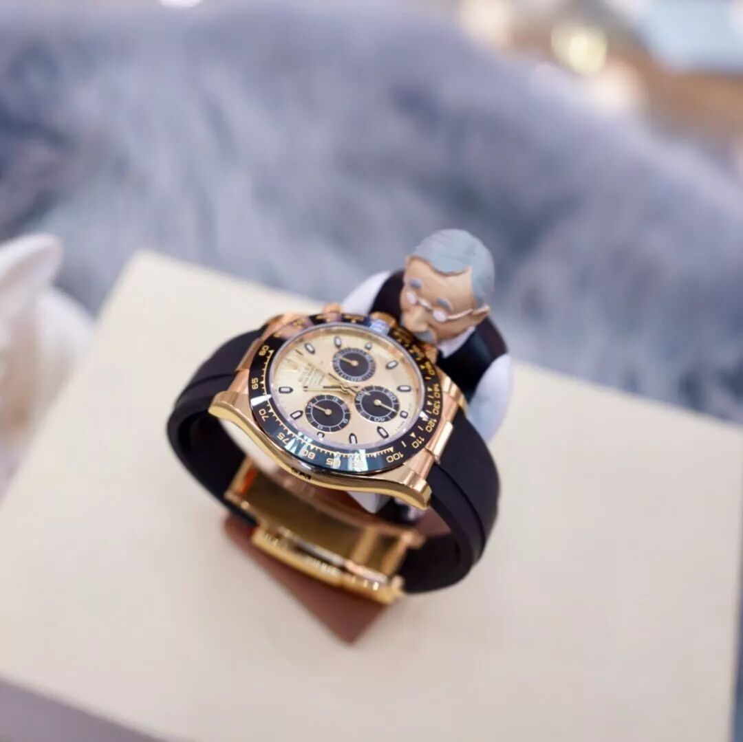勞力士Daytona(迪通拿),116518LN,黃金材質,陶質外圈,賽車計時款,40mm表徑,太陽紋盤面,極具奢華,防水性能也優越,個人感覺橡膠表帶更加百搭和耐用,不怕磨損,不怕汗水,春夏秋冬皆適合佩戴,國內專櫃已經斷貨很久了,國內售價21萬不到,正所謂「一勞永逸」,大家值得擁有。