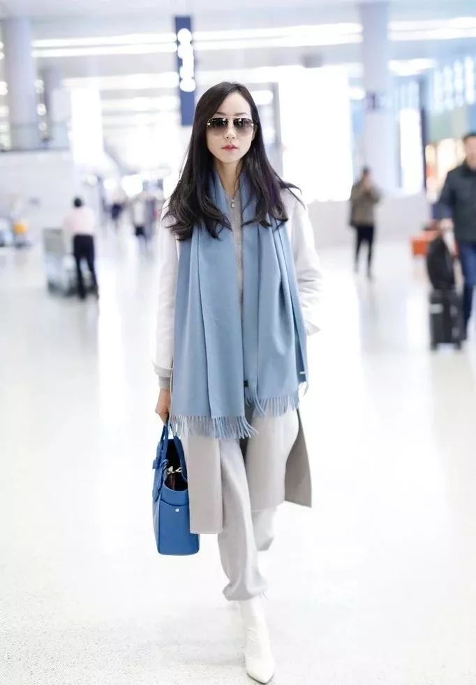 氣質女神韓雪也選了一身銀白色的奶奶褲,搭配藍色微博,很有春天的感覺。
