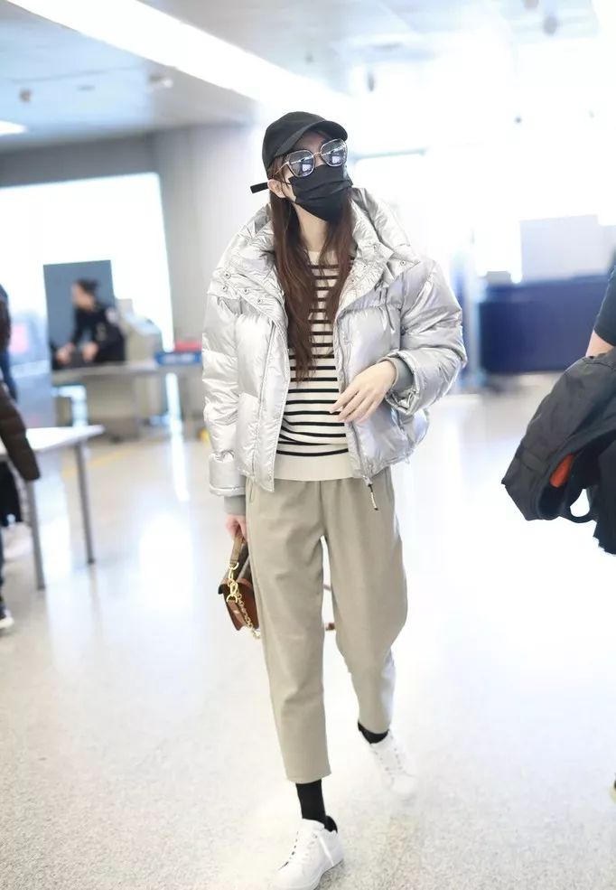 首先,這種奶奶褲寬鬆好穿,里面套幾條秋褲也不明顯,還能穿出各種顏色,擺脫冬日里只有黑色的沉悶。唐嫣穿亞麻色配銀色羽絨服,主打淺色系穿搭,十分亮眼。