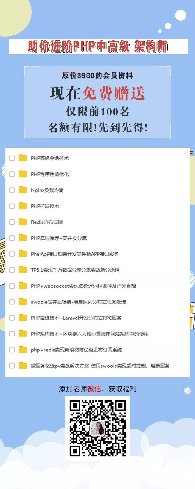 這套精品PHP教程絕不是市場上的那些妖艷賤貨可比,web前端零基礎的人員也可以學習,對於那些PHP開發1-5年的人員、正處於瓶頸期,想要突破自己的,進階中高級工程師對你更是如虎添翼,名額有限,先到先得!