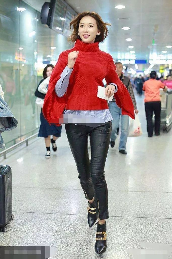 林志玲的膚色是比較白皙的,所以穿這種大紅色的毛線衣也能夠非常襯托她的膚色。下半身搭配了一條黑色的皮褲,更加的氣質。