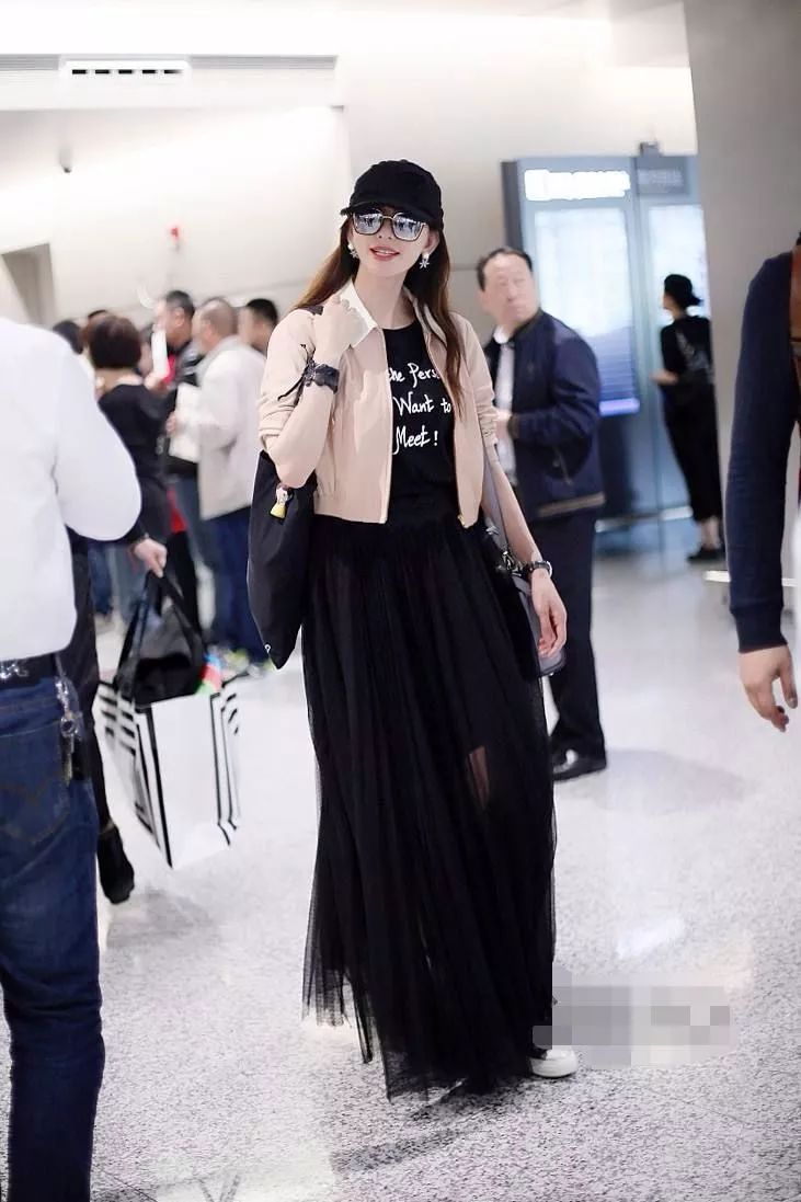 下半身將要齊地的黑色紗裙非常精致呀,林志玲上半身的內搭也是一件黑色的T恤,上面還印著白色的字母。別套了一件粉色的外套。