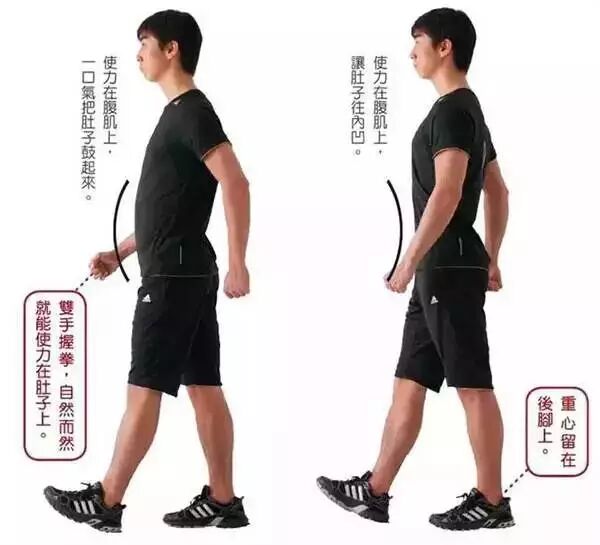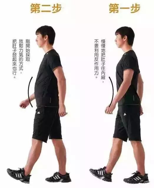 不要大幅度擺動手臂,也不要駝背,因為這樣會在肚子鼓起和內縮時出現反作用力,導致肌肉的熱量消耗減少,還會給腰部帶來不必要的負擔,進而造成腰痛。