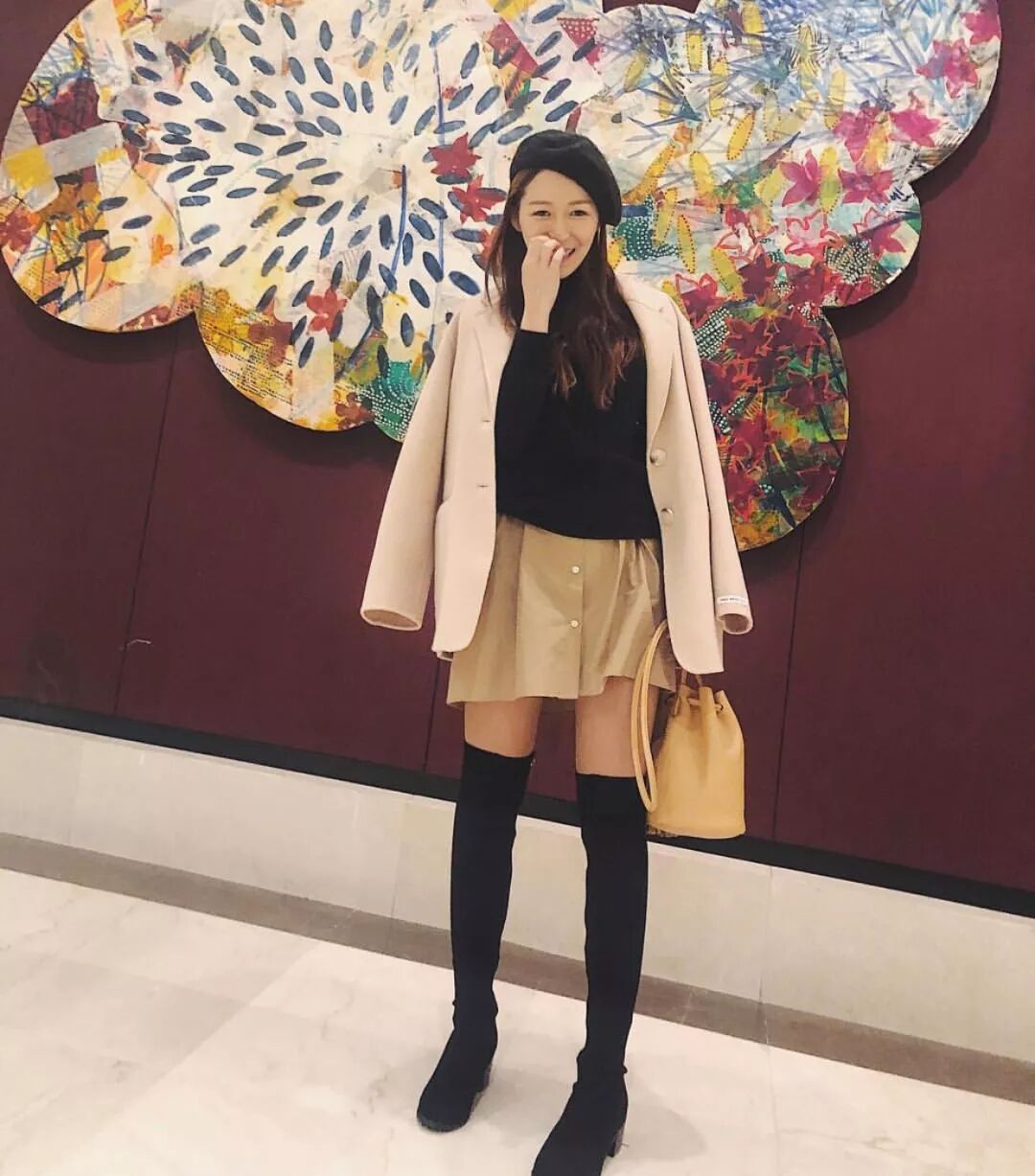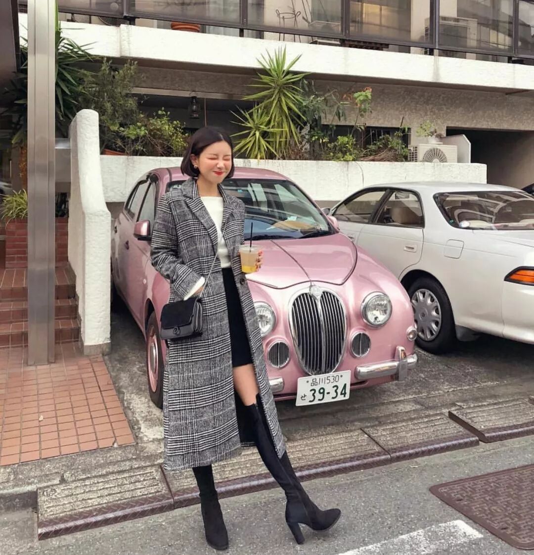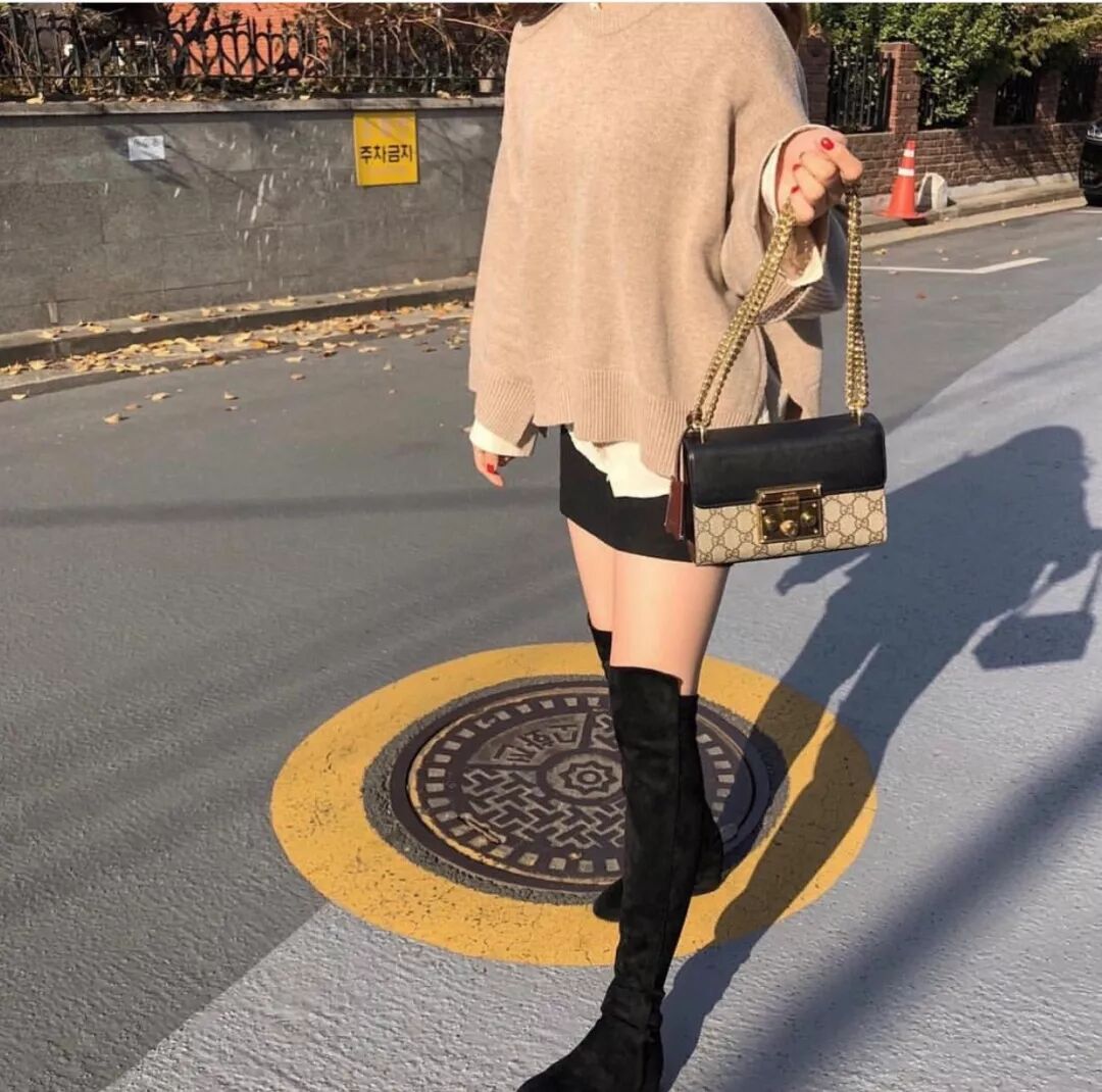 長筒靴+毛衣的搭配也是明星私服中常見的搭配,奶牛的黑白毛衣可愛俏皮,十分減齡,而且簡單又實穿。