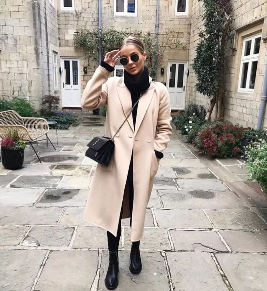 溫度沒有零下的話,大衣+毛衣+短靴的穿搭是冬天的標配,黑白的配色簡約高級,大翻領讓整套吸睛不少。