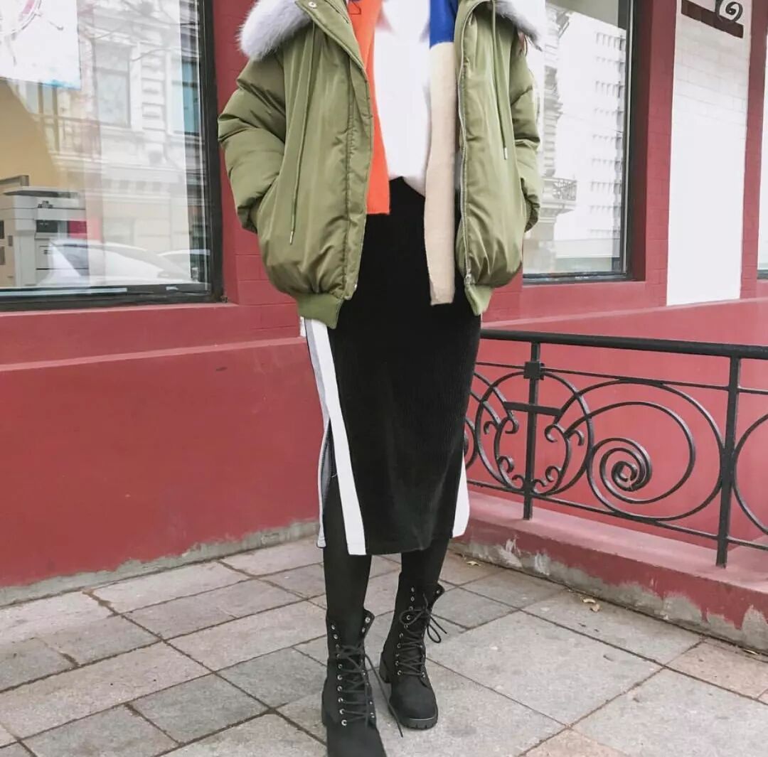 更冷一點的話可以搭配棉服,做內搭的毛衣以保暖貼身為主,上身的柔軟和馬丁靴的硬朗相結合,滿滿的街頭范。