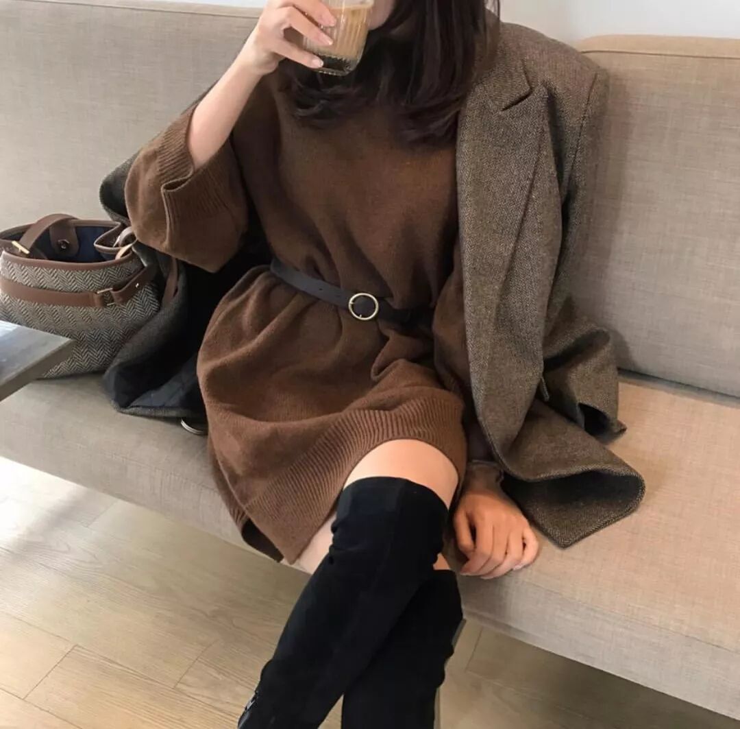 毛衣裙加根腰帶的小心機不僅增加時尚感,還能分割出腰線,讓身材比例更好看,搭配長筒靴和西裝,就是精致的職場風。
