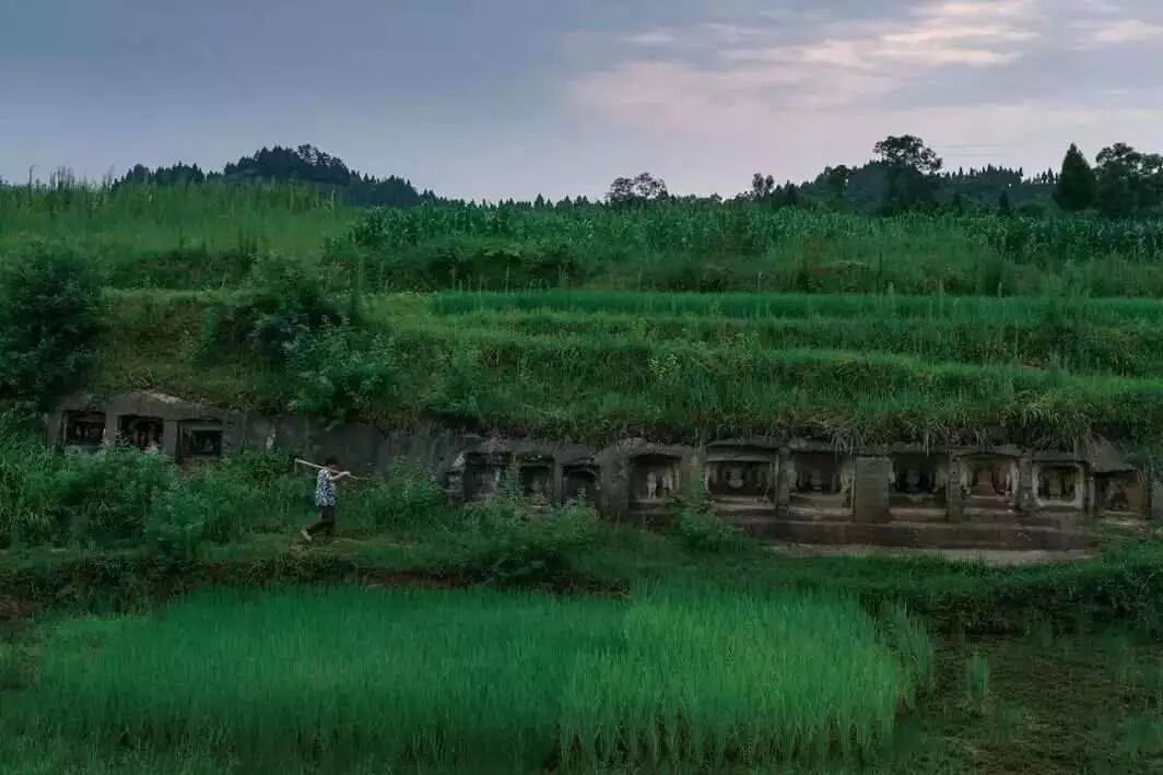 ▲四川巴中市興文鎮沙溪村,一位婦女走過唐代小佛龕石刻群。如今這些佛像石刻已被遷走,高鐵從這里修過。2011年 袁蓉蓀/攝