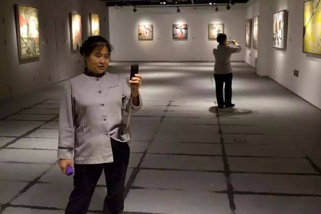 ▲北京,一家美術館內,兩位保潔員在用手機拍攝展覽的藝術品。2013年6月 盧北峰/攝