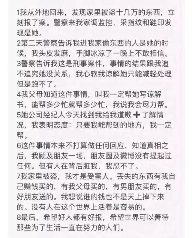 曹斐然感到很震驚,但心軟的她仍希望能減輕處理結果,父母也希望她能幫就幫,而這位「小偷」的經紀人也曾上門道歉。曹斐然本想大事化小,但自曝沒想到自己是受害者還能被抹黑,在氣憤之下發朋友圈曝光