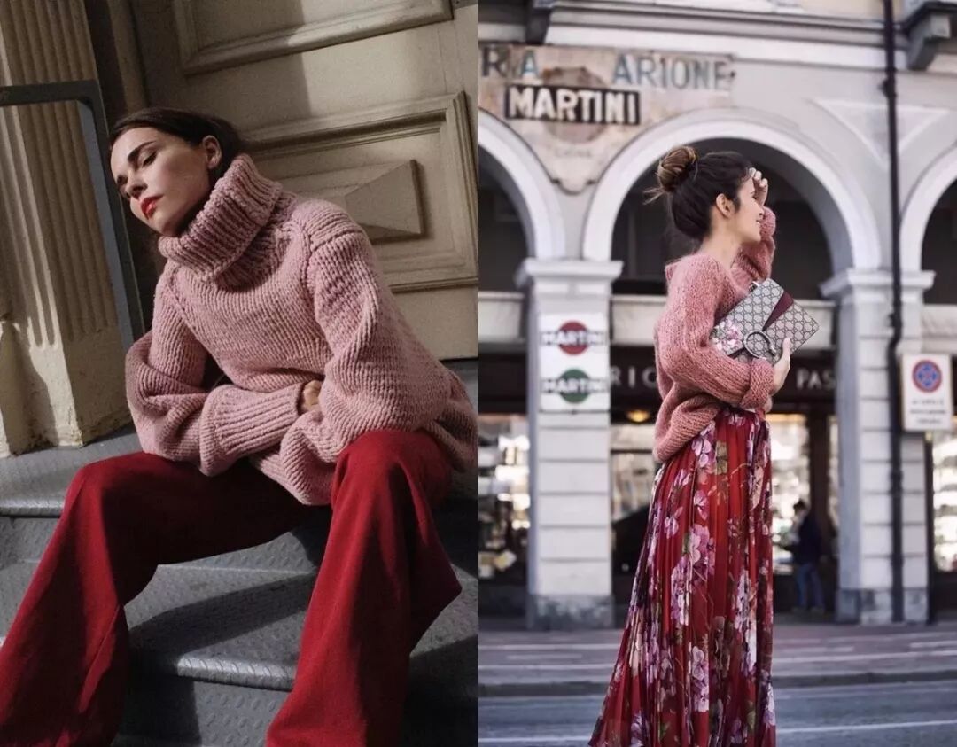乾枯玫瑰粉衣服+闊腿褲,高級優雅;+印花酒紅裙,很有女人味~