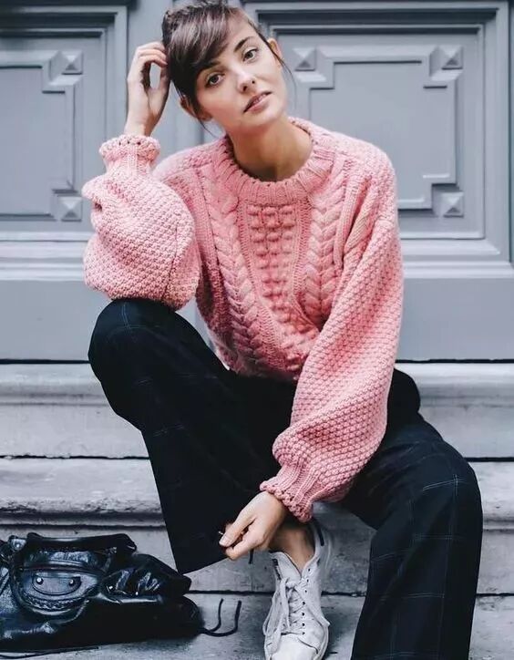 束袖子的乾枯玫瑰粉毛衣+黑色闊腿褲,既隨性又優雅!