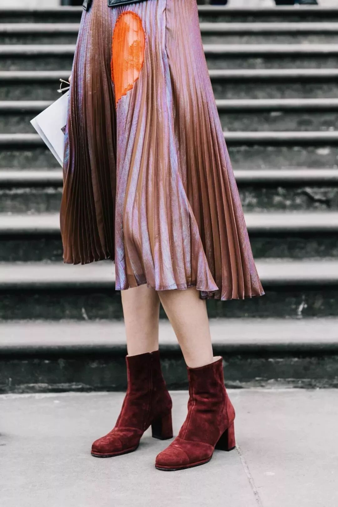 還有最喜歡這雙酒紅色絲絨粗跟靴+乾枯玫瑰粉百褶裙,真的是超級好看!!!