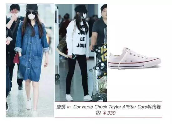 作為大冪冪的中國好閨蜜唐嫣,腳上這雙白色為主色,黑藍、紅描邊下作為輔助的帆布鞋。