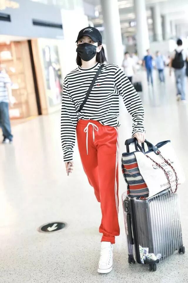 上身黑白條紋長衫搭配一條紅色休閒運動褲,給一種活力無限,驕陽似火的感覺。