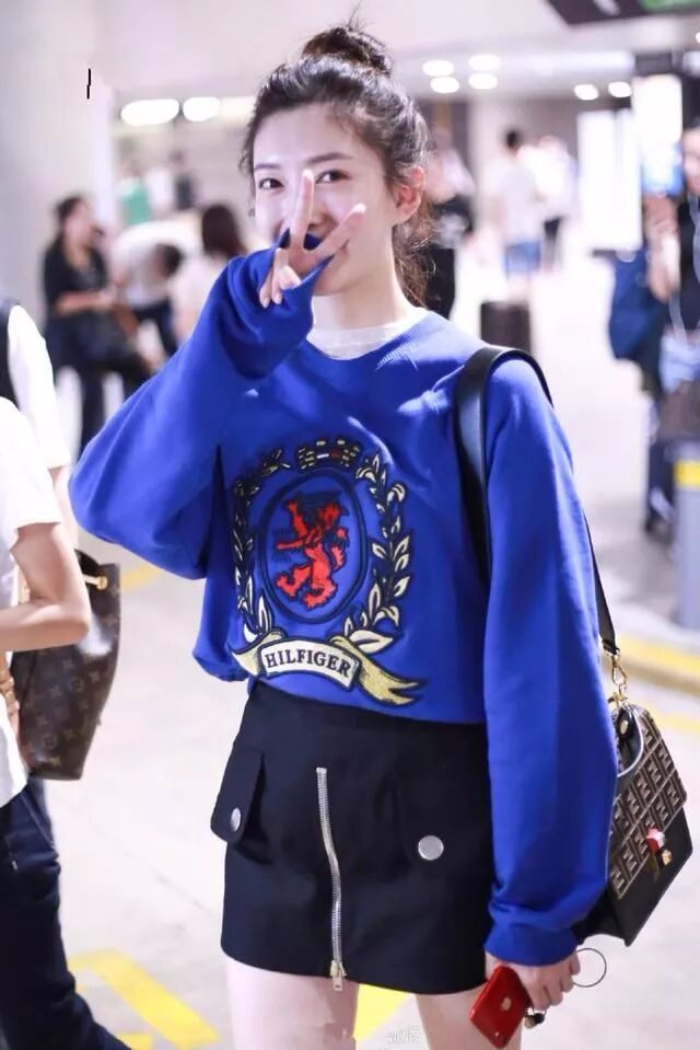 江疏影上半身穿的十分接地氣,一件藍色運動衛衣,寬鬆有型,上身更加舒適,同時胸前的水印圖案,也十分洋氣呢。