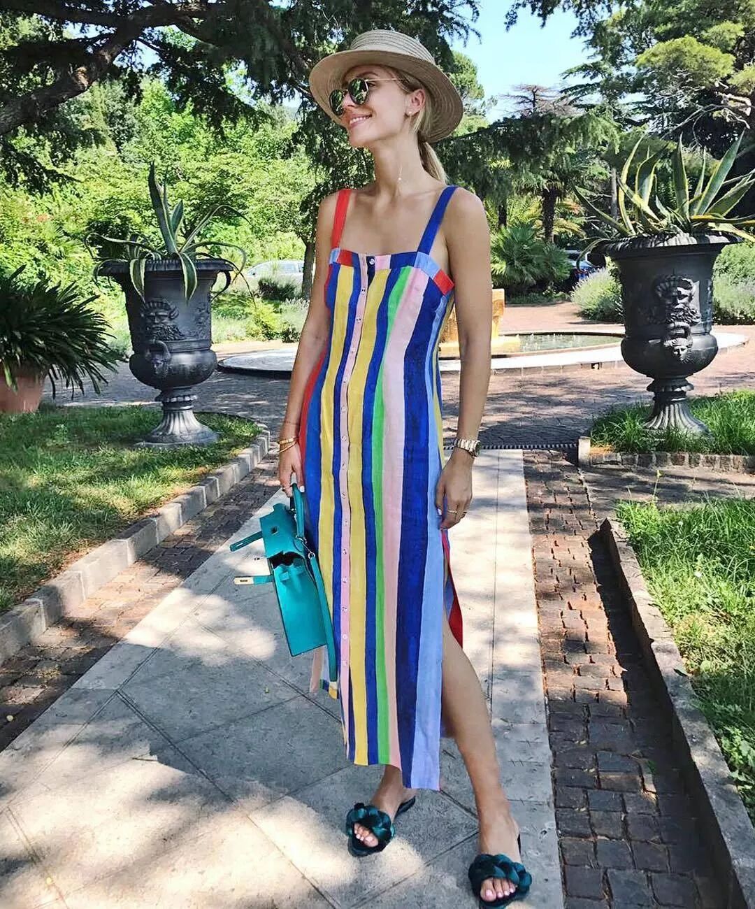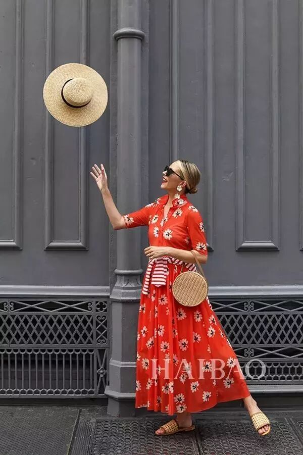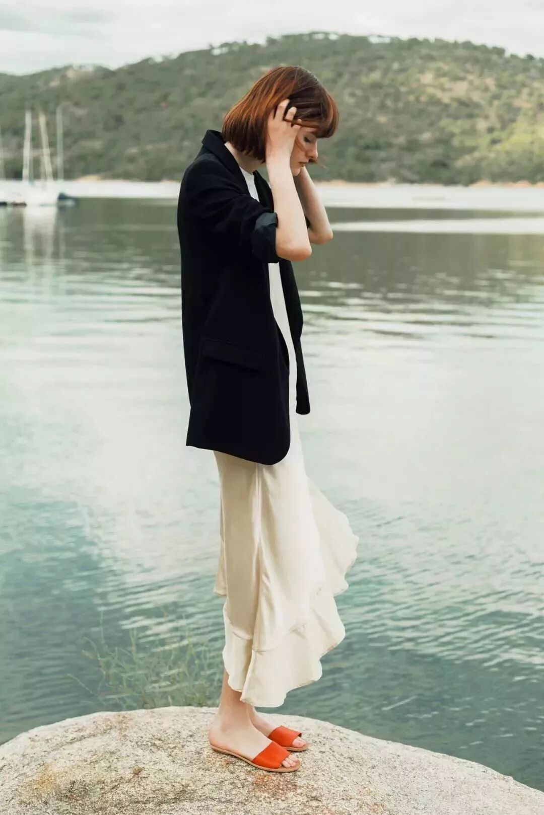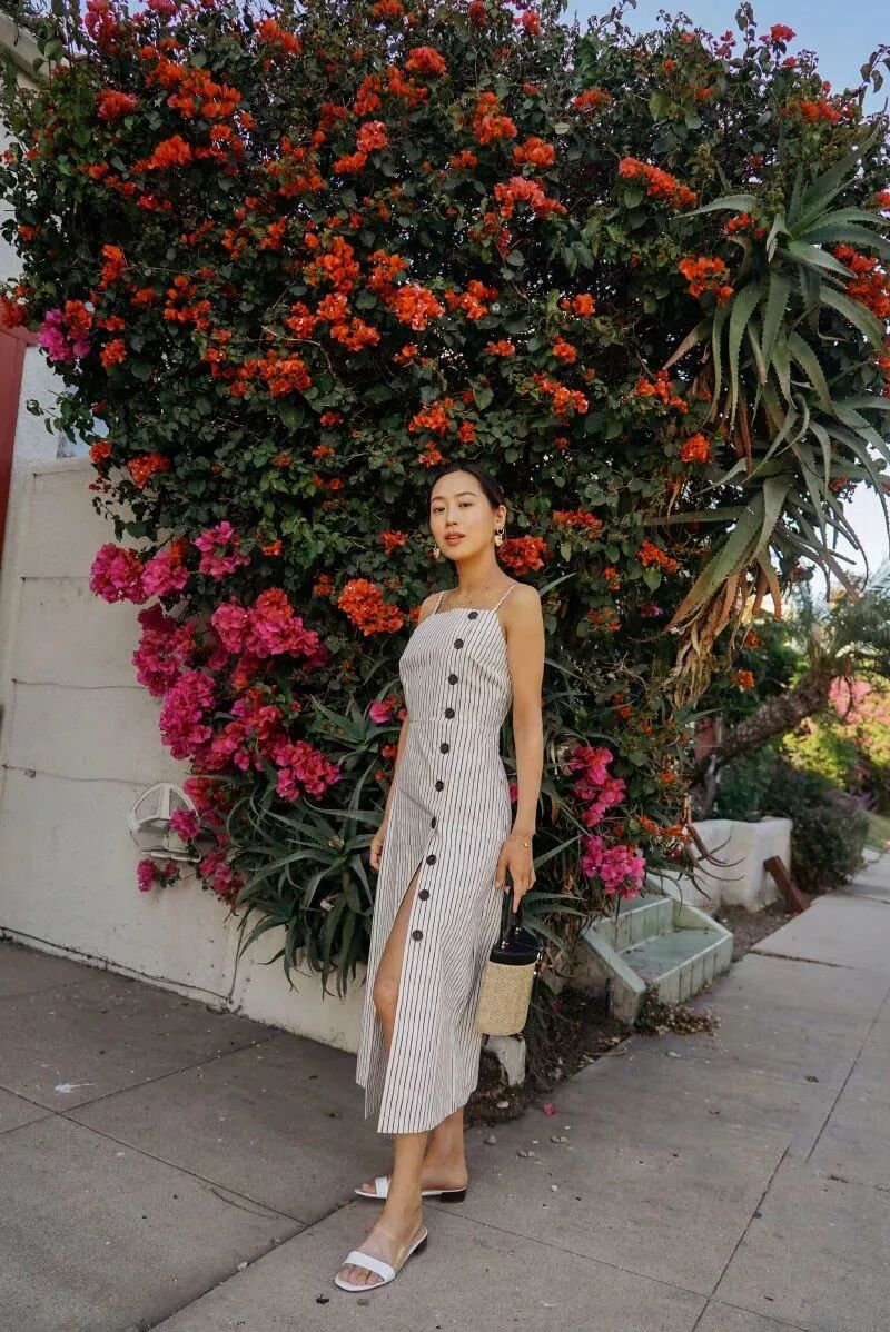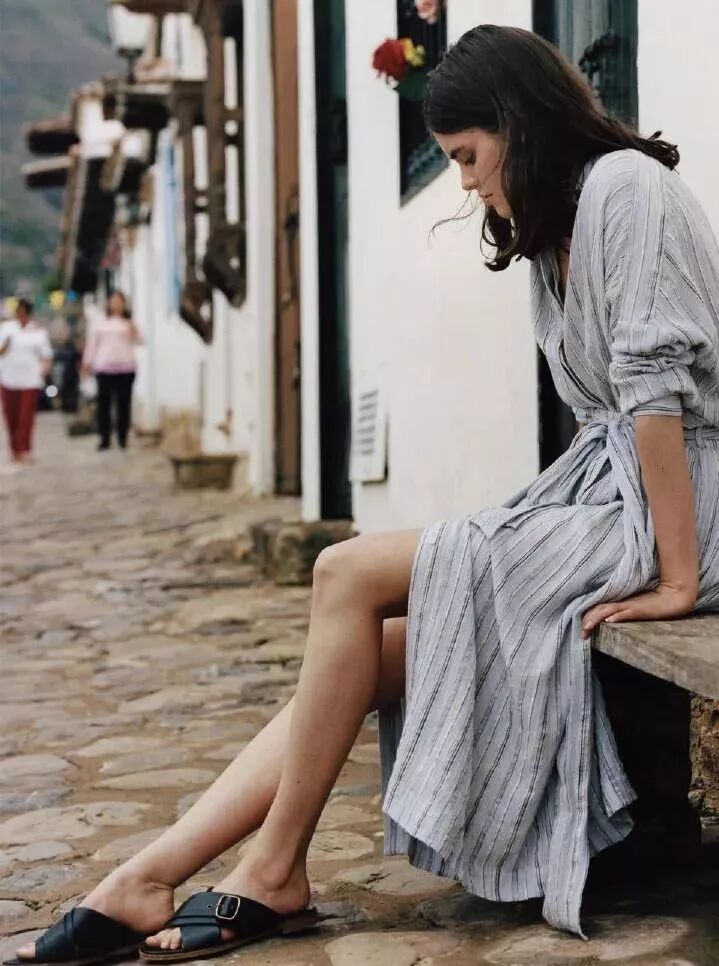之前就很多次的說過了平底鞋配連衣裙,拖鞋亦是如此,更顯休閒隨意。堪稱是夏日里最省心的穿衣方法了。