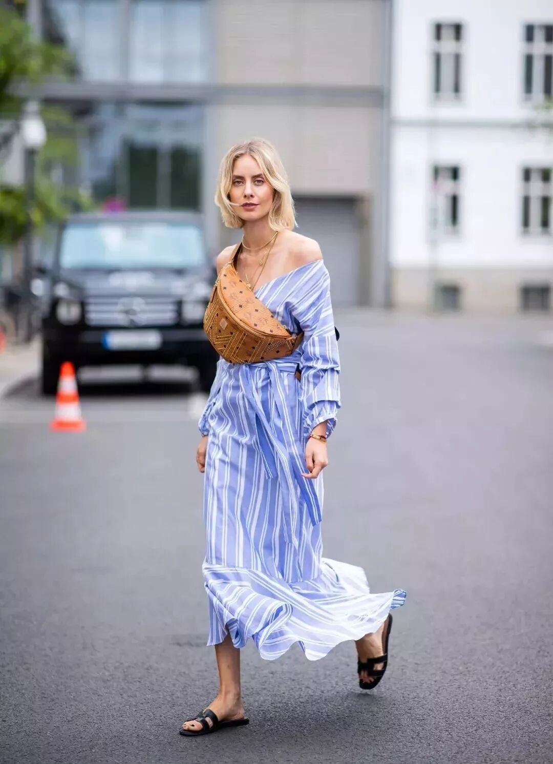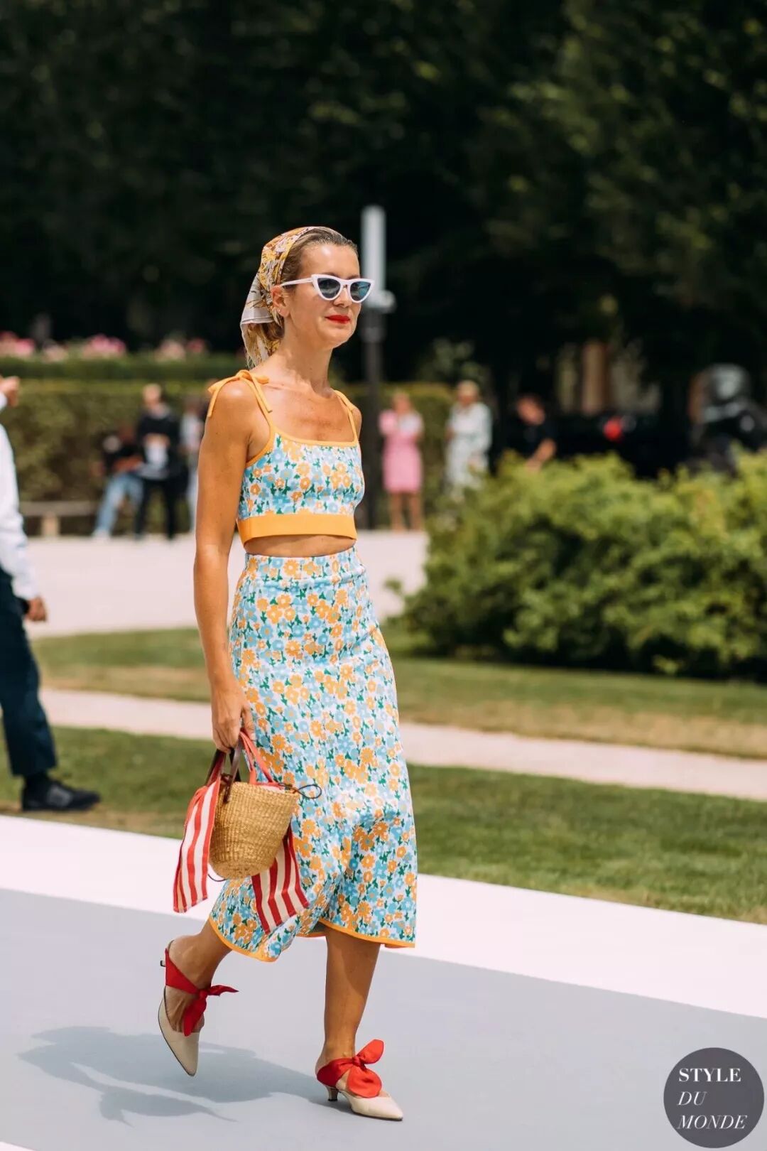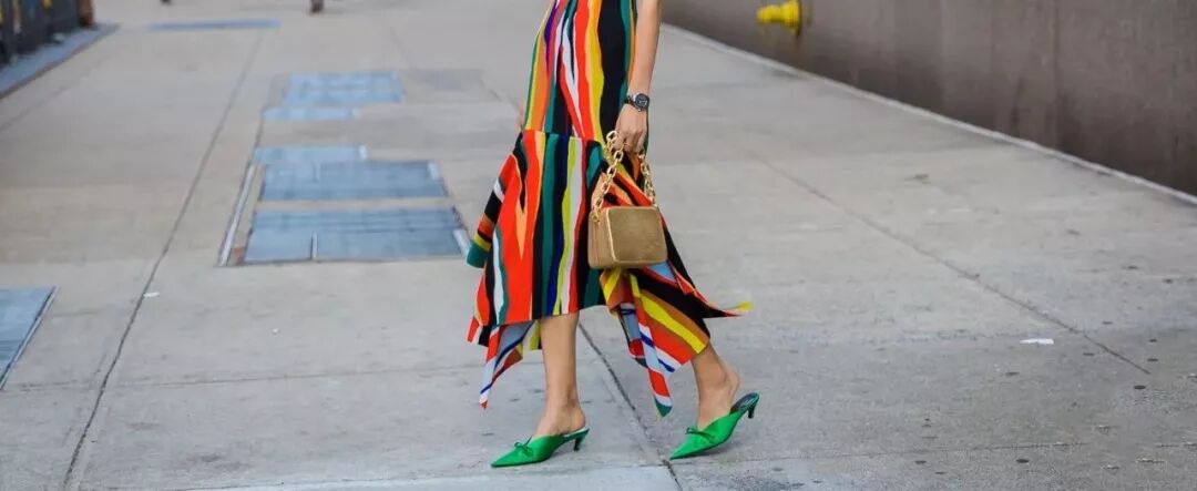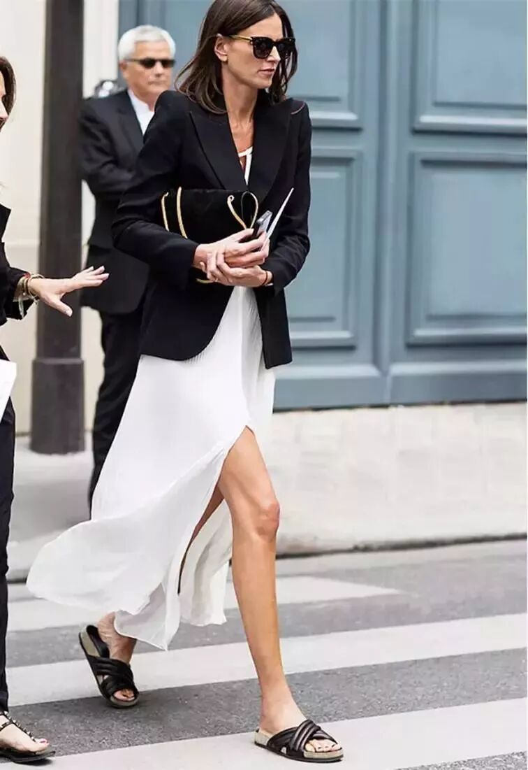 草編拖鞋像是一股清流,很時髦也不會顯low。經過裙裝的演繹,露著高級感。