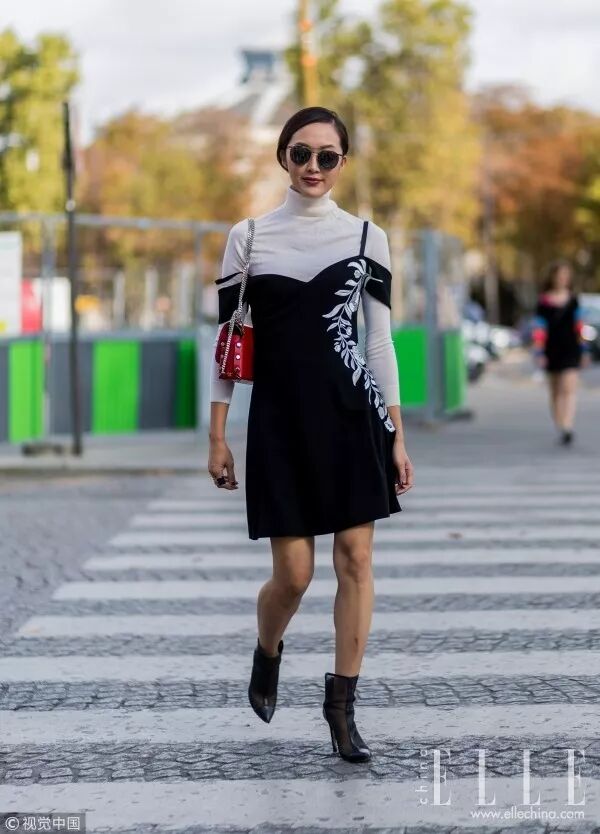 插肩袖T恤的魔力就在於拼色的視覺減重效果非常強烈,趙薇這件拼色插肩袖長袖T肩膀處的黑色「削膀子」效果一流,肩膀處看起來削薄的不得了。這樣一來,整個上身立刻減重十斤根本不再是夢!