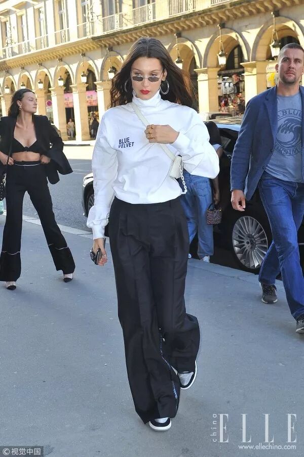 Bella Hadid身上這件白色的寬鬆長袖T恤因為材質的挺括才不會看起來松垮無型,高領的設計也頗為禁欲。搭配黑色及地闊腿褲和運動鞋,Bella就這樣不費力地成為了初秋街道上最時髦最元氣的驚奇少女!