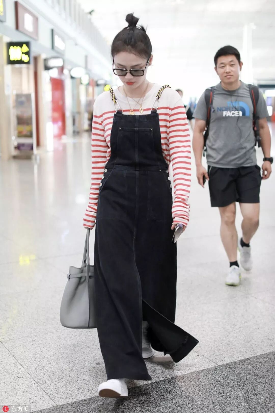 馬思純這條牛仔裙內搭一件紅色條紋長袖T,肩膀處的白色色塊顯的肩膀線條很好看,可是溜肩女生們的福音哦~這樣穿去趕飛機,七月姐姐對於舒適度的要求可見一斑。