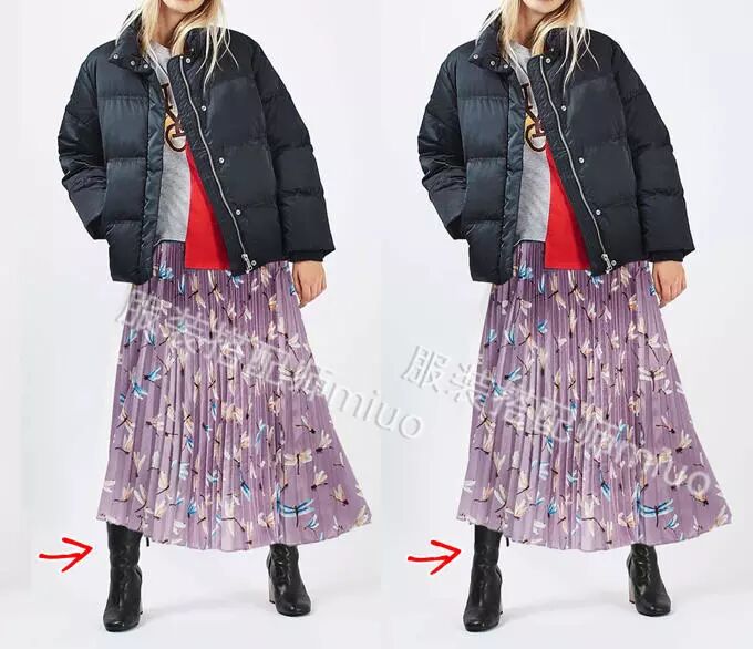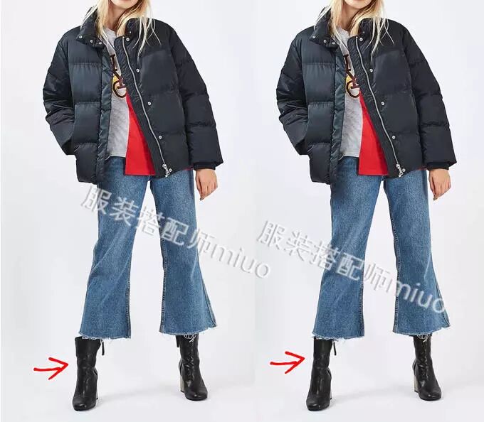 再來看下圖,注意模特的腳部,同樣都搭了靴子,靴筒粗而松垮的,顯下半身笨重;靴筒窄而包腿的,整個人都顯瘦一點、顯高一點。