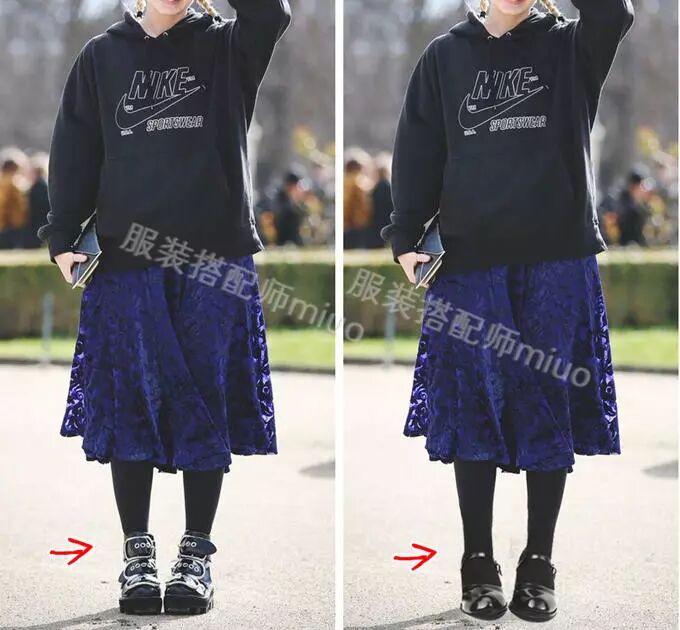 同樣都是對身材沒什麼要求的寬鬆衛衣+半身裙,搭個笨重的鞋子,顯得整個人很笨拙;而換雙鞋型窄長利落的牛津鞋,就顯得輕盈多了。
