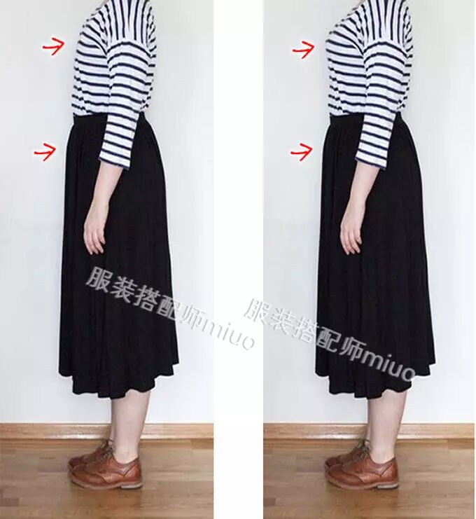 如下圖中箭頭所示,當上衣下擺塞腰頭時,如果裙子的面料太薄、有垂感,那麼小肚子依然會很明顯,而且也會暴露胯寬;但如果裙子的面料挺括,裙擺就會呈現出一定的蓬度,此時小肚子就會被恰到好處的隱藏在微微蓬起的裙擺之下,成功轉移重點!