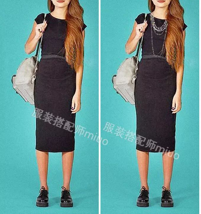 舉個例子:這個模特很瘦,但穿著修身的連衣裙,小肚腩還是有點明顯的。此時只要戴一串多層長項鏈,就能分散注意力,讓視覺重心落到上半身、脖子附近,而不是徘徊在腰腹部。當然,把項鏈換成絲巾也可以。