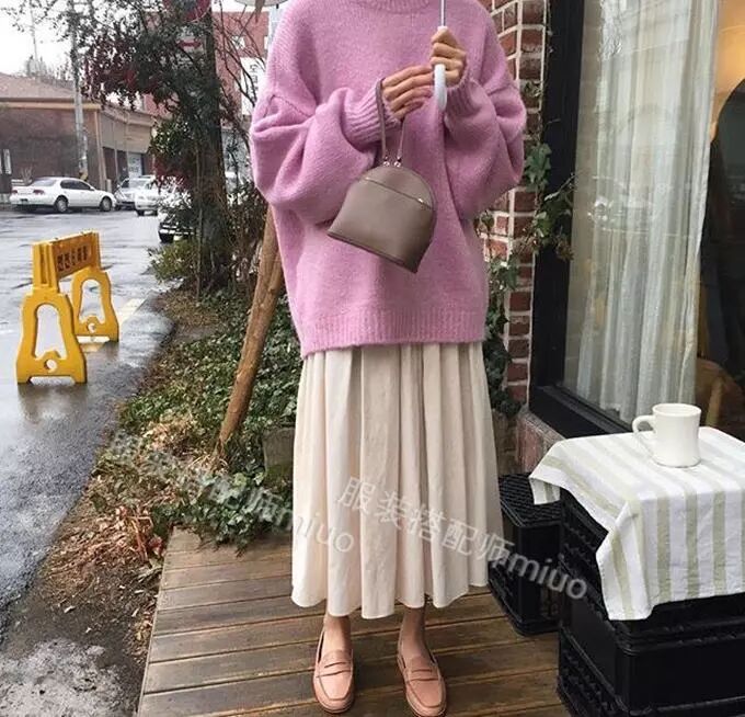 街拍中的「上寬下垂」,一般就是毛衣/針織衫/衛衣+細百褶裙/雪紡裙/垂感的闊腿褲等等。注意模特們所穿的鞋子,也都是鞋型利落的款式!
