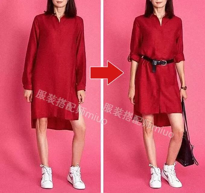 有些寬鬆連衣裙是直筒型設計,建議可以自己系個腰帶。注意,這里系腰帶,目的是為了「分割身材比例」,並不是要你勒出自己肚子的輪廓!所以不需要系太緊,「定位腰線」的功能到位即可。如下圖: