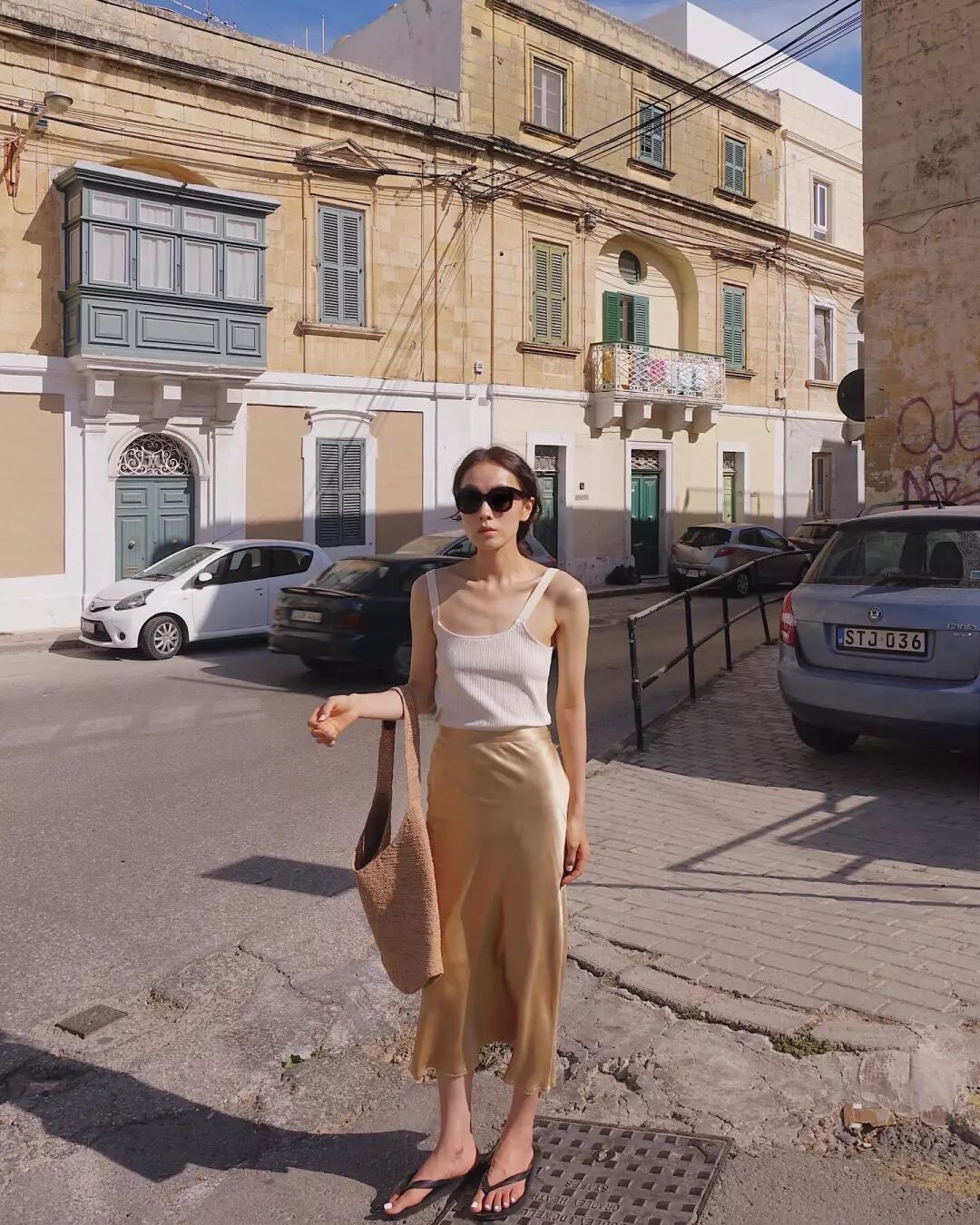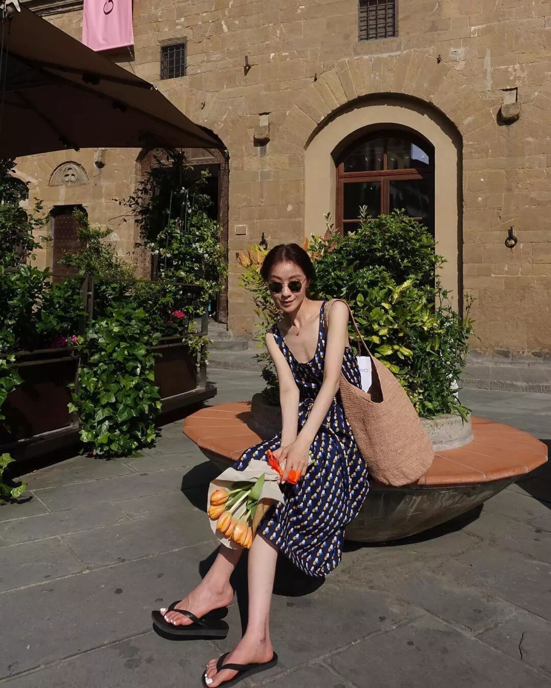 出行時一件碎花吊帶裙,隨便穿上一雙人字拖超隨性。